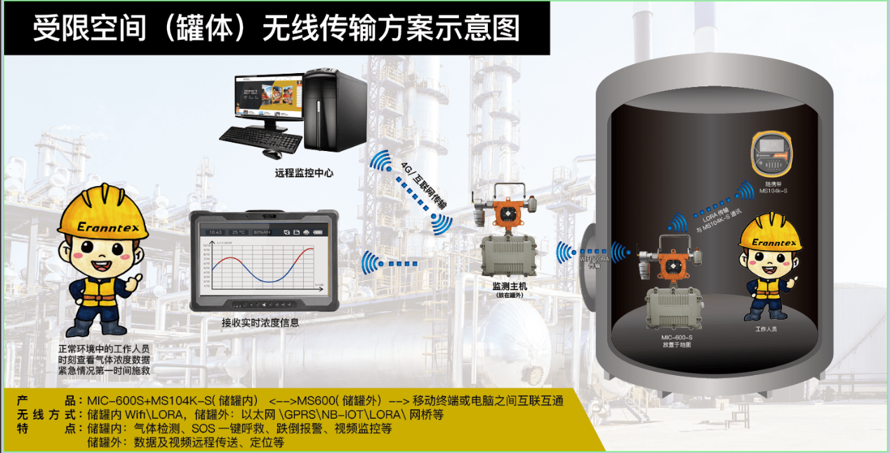 今天,我們就以氣體檢測(cè)行業(yè)的老大哥逸云天Eranntex為例,來(lái)說(shuō)說(shuō)如何進(jìn)行受限空間的氣體檢測(cè)。首先,在進(jìn)入受限空間作業(yè)前,工作人員會(huì)先用逸云天MIC-600S主機(jī)或泵吸式MS600對(duì)受限空間采樣檢測(cè),以檢測(cè)密閉空間中的氧氣、硫化氫、可燃?xì)狻OC揮發(fā)性有機(jī)化合物等。確定安全后,工人才可以進(jìn)入作業(yè)。作業(yè)中,逸云天MIC-600S監(jiān)測(cè)主機(jī)在罐體外,將攝像頭架設(shè)在受限空間,工人佩戴一臺(tái)逸云天便攜式檢測(cè)儀MS600進(jìn)行作業(yè),隨時(shí)檢測(cè)所處環(huán)境的氣體濃度狀況,外邊監(jiān)護(hù)人員可通過(guò)手機(jī)或ipad進(jìn)行查看監(jiān)測(cè)數(shù)據(jù)和視頻圖像,實(shí)現(xiàn)遠(yuǎn)程高風(fēng)險(xiǎn)操作一體化監(jiān)管,徹底解決行業(yè)痛點(diǎn)。