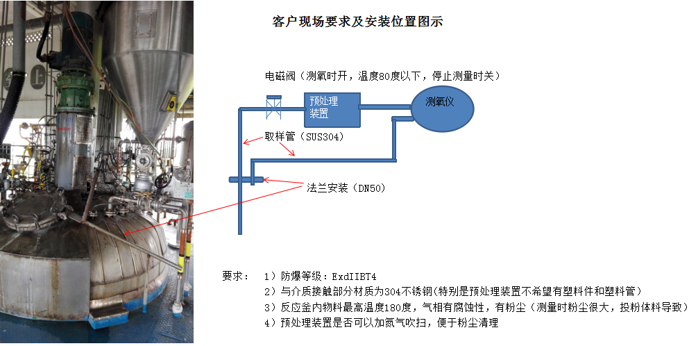 客戶為生產經營丙烯酸樹脂、醇酸樹脂、無油醇酸樹脂、干性醇酸樹脂、不干性醇酸樹脂、聚氨酯樹脂、7110甲聚氨酯固化劑、聚氨酯粘合劑、環氧樹脂、不飽和聚酯樹脂、有機金屬鹽類粘合劑、有機酸鹽類粘合劑。產品境內外銷售。從事異丁醇、3-甲氧基丁基乙酸酯、甲基丙烯酸甲酯、甲基丙烯酸乙脂、甲基丙烯酸丁酯、甲基丙烯酸異丁酯、六亞甲基二異氰酸酯、馬來(酸)酐及其它非危險化學品的原材料的化學品日式外商合資企業,需要對生產制程中反應釜內氧氣含量進行監控,保證氧氣的濃度。