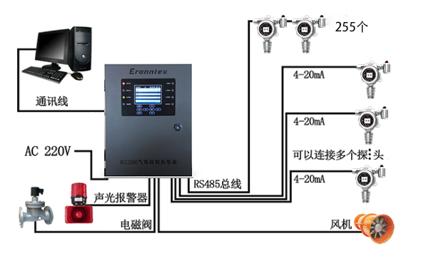 逸云天公司殘留磷化氫檢測報警系統包括氣體檢測探單元、信號傳輸采集單元、顯示單元(報警控制主機上集中顯示)、監控器、控制單元、報警單元、被控設備單元(如風機、電磁閥)組成。